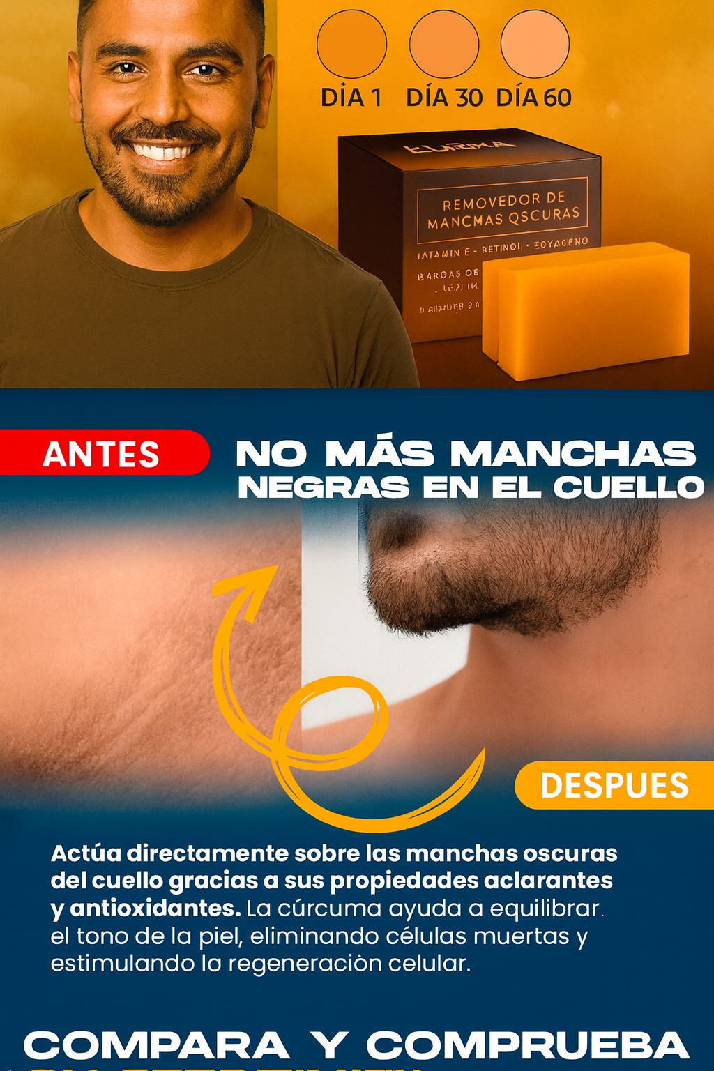 Sabemos lo incómodo que es tener granos o manchas que no desaparecen sin importar lo que uses. El Jabón de Cúrcuma Natural limpia profundamente, elimina la grasa y renueva tu piel sin químicos agresivos. Resultado: rostro limpio, firme y con buena apariencia desde la primera semana.